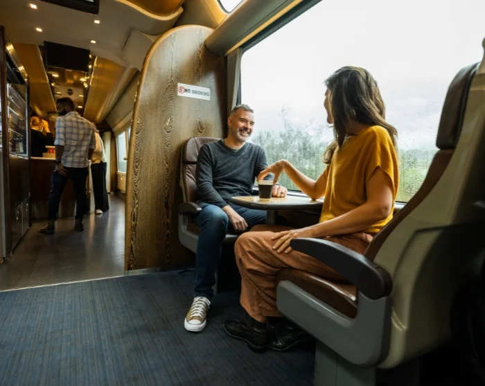 De trein beschikt over een open panoramawagen, waar u buiten kunt staan, genieten van de frisse lucht en schitterende foto’s kunt maken. Neem wel warme kleding mee als u dit van plan bent. Daarnaast is er een café aan boord waar u eten en drinken kunt kopen.