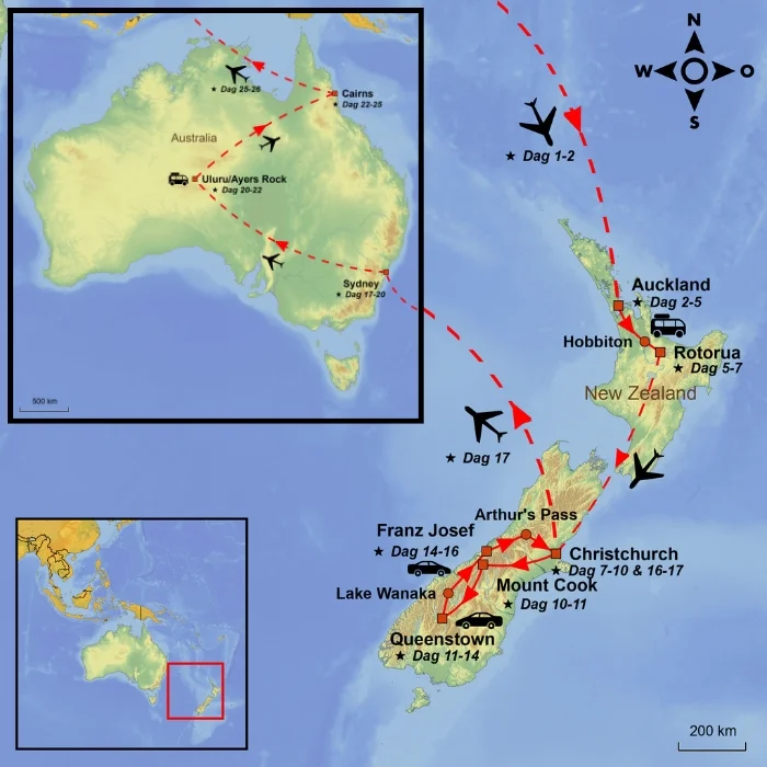 Uw avontuur begint in Nieuw-Zeeland, waar u wordt ondergedompeld in de Maori-cultuur, geothermische natuurverschijnselen, bergmeren en gletsjers. Daarna reist u door naar Australië. Hier ontdekt u het bruisende Sydney, het indrukwekkende rode hart van de outback bij Uluru en sluit u uw reis af in het tropische Cairns.