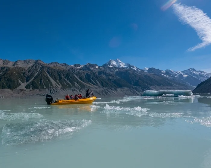 Voordat u het Mount Cook-gebied verlaat, kunt u overwegen om ter plaatse een optionele boottocht te boeken over het Tasman Lake. Hier komt u heel dichtbij kleine ijsbergen en de Tasman-gletsjer – de grootste gletsjer van Nieuw-Zeeland.