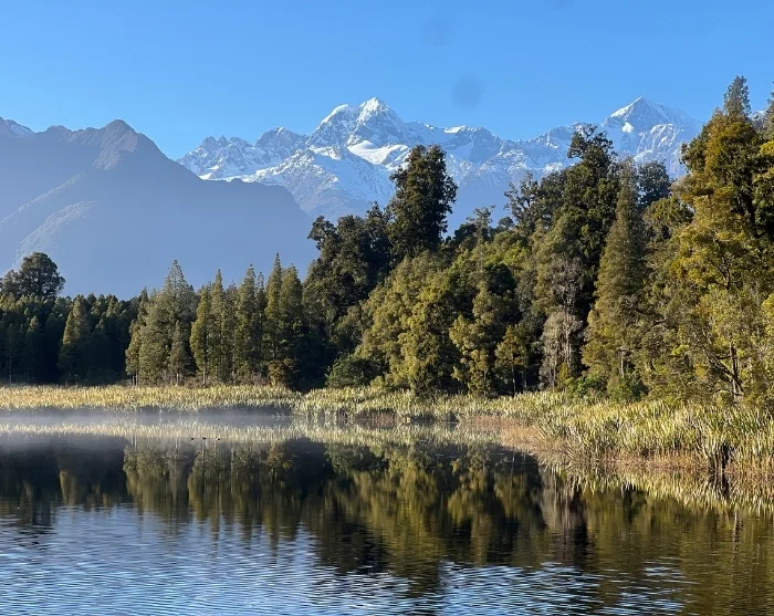 Uw route vervolgt zich over de Haast Pass richting de ruige, groene westkust, waar het landschap steeds weelderiger en spectaculairder wordt. Nog vóór aankomst in Franz Josef adviseren wij een pauze bij Lake Matheson (Te Ara Kairaumati), beroemd om de prachtige weerspiegelingen van Mount Cook en Mount Tasman in het water. Ook vindt u hier het uitkijkpunt Te Kopikopiko o te Waka, dat op een heldere dag een fantastisch uitzicht over de Fox-gletsjer biedt.