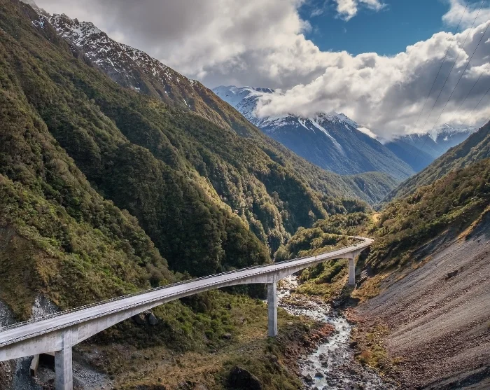 Vanaf hier gaat de reis verder naar Kumara Junction, waar u landinwaarts afslaat naar Nationaal Park Arthur’s Pass. Het landschap verandert spectaculair: het regenwoud maakt plaats voor alpenstruikgewas en steile bergen. Bij het Otira Viaduct-uitkijkpunt wordt u getrakteerd op een schitterend panorama van het imposante viaduct dat zich een weg door de vallei baant. Let onderweg op de kea, de enige alpenpapegaai ter wereld, die hier vaak te zien is.