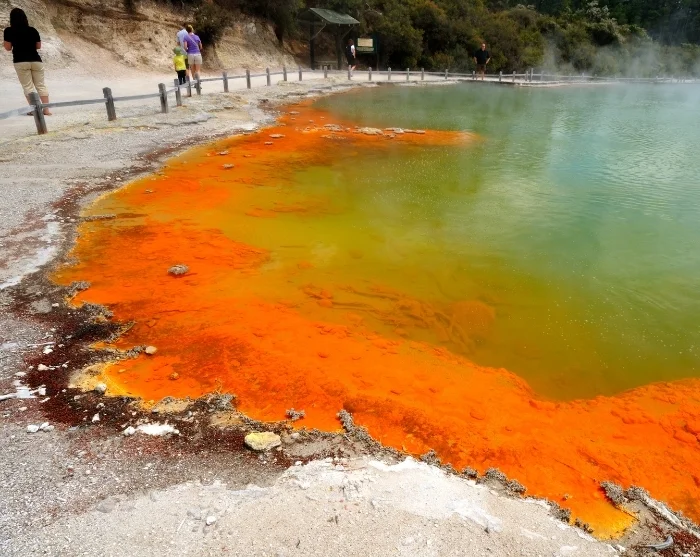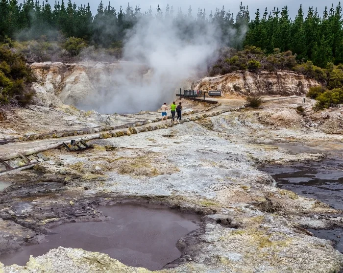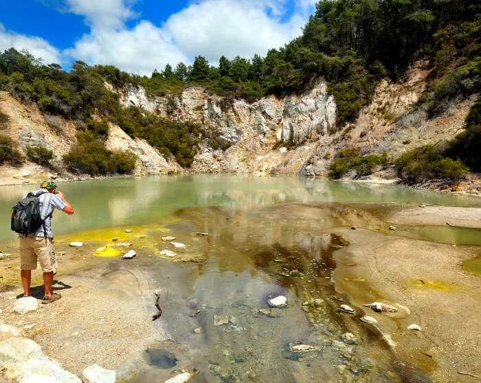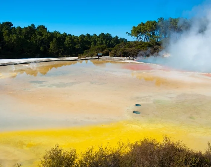 Onderweg is er tijd voor lunch- en koffiepauzes (voor eigen rekening), waarna de reis verdergaat naar Wai-O-Tapu. Hier hebben indrukwekkende natuurkrachten een kleurrijk en betoverend geothermisch landschap gevormd, met hoogtepunten als Champagne Pool, kratermeren en zwavelrijke stoom die uit de aarde omhoog kringelt. Het gebied heeft een bijna buitenaards karakter en de kenmerkende zwavelgeur hoort helemaal bij de beleving.