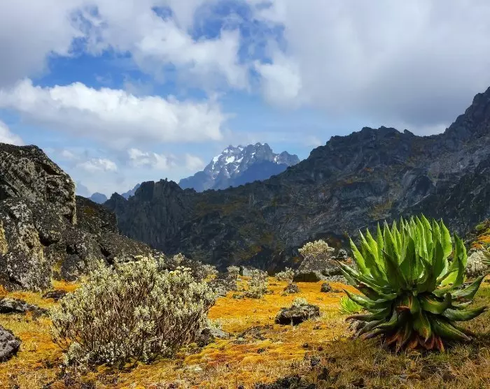 Vanaf de heuvelkam rond Kibale geniet je van een fenomenaal uitzicht over de zachte, groene heuvels met op de achtergrond het Rwenzori-gebergte.
