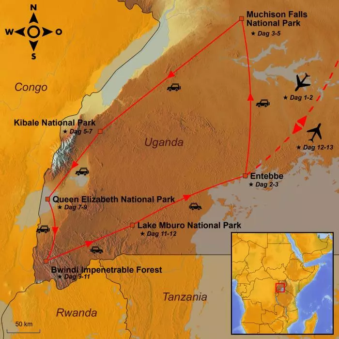 Deze reis voert u langs hoogtepunten in Oeganda: Lake Victoria, het één na grootste zoetwatermeer ter wereld, de evenaar en 3 nationale parken: Queen Elizabeth, Bwindi Impenetrable & Lake Mburu.