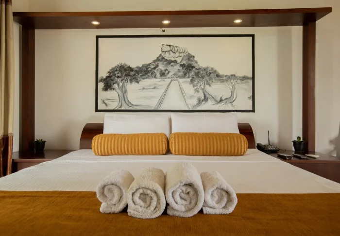 Aliya Resort & Spa ligt te midden van het weelderige landschap van Sigiriya en biedt een betoverend uitzicht op de iconische Lion Rock, die hoog boven de boomtoppen uitsteekt. Hier gaan natuur en design moeiteloos samen in stijlvol ingerichte ruimtes, wat zorgt voor een serene sfeer.