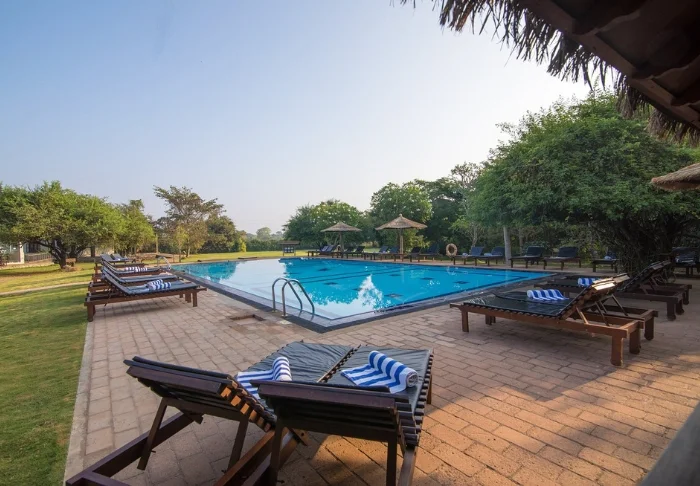 Wanneer u niet op safari bent, kunt u zich terugtrekken bij het zwembad van het resort – een rustige oase midden in het groen. Neem een verfrissende duik of ontspan op een ligstoel met een gekoeld drankje van de zwembadbar. Er is ook een kinderbad, waardoor het zwembadgedeelte perfect is voor zowel rustzoekers als gezinnen. Voor wie graag actief blijft, heeft het resort ook een fitnessruimte met moderne apparatuur.