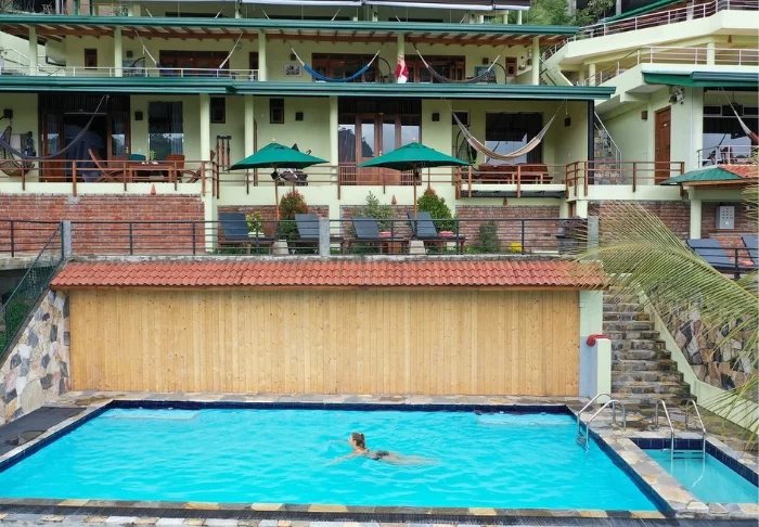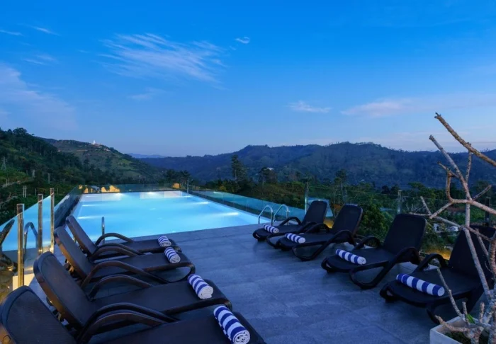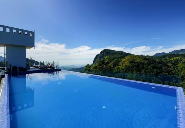 Boven in het Morning Dew Hotel vindt u een prachtig dakterras met een van de mooiste zwembaden van Ella. Hier kunt u een verfrissende duik nemen terwijl u zich vergaapt aan het indrukwekkende 360-graden uitzicht over de bergen, voordat u weer terugkeert naar de werkelijkheid. Vanuit het hotel loopt u eenvoudig naar de hoofdstraat van Ella met gezellige cafés en leuke winkeltjes—bedenk wel dat de wandeling terug omhoog vrij steil is.