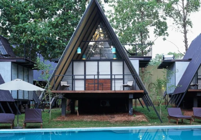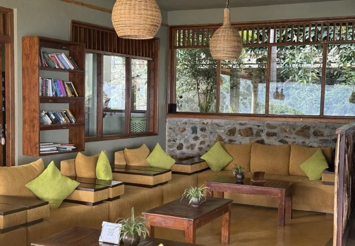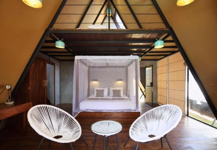 De lodge bestaat uit 20 hutten, die verspreidt liggen in de groene theeplantage. Alle hutten zijn gebouwd van gerecyclede materialen. De hutten zijn gebouwd van oude zeecontainers, de muren en plafonds zijn gemaakt van bamboe en de terrassen zijn gemaakt van spoorbielzen.