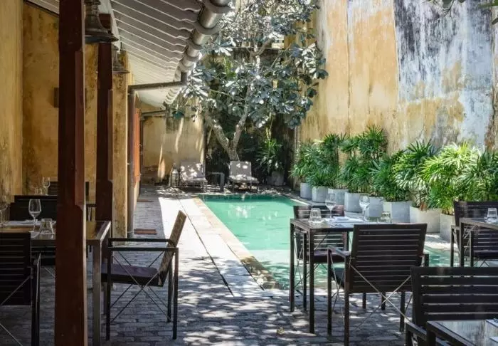 Het hotel heeft een idyllische binnenplaats met de prachtige bloemen van de plumeria (frangipani), die contrasteren met de charmante afbladderende gele muren. Er is ook een klein zwembad met bijbehorende ligstoelen.