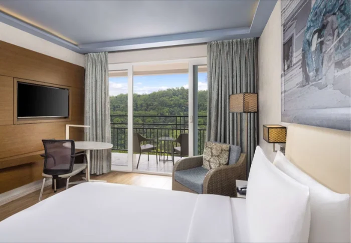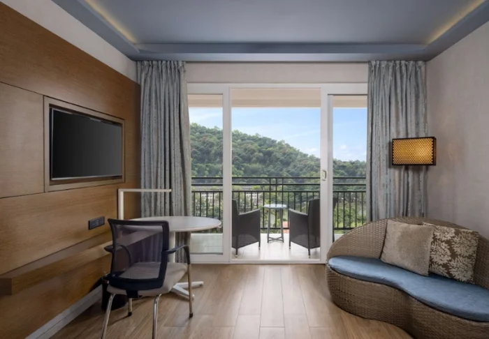 U overnacht in een Deluxe Kamer, prachtig ingericht in een moderne, minimalistische stijl. Lichte tinten zorgen voor een luchtige sfeer, terwijl het balkon uitnodigt om te genieten van de rust en het uitzicht. De kamer is voorzien van alle gemakken voor een comfortabel verblijf, zoals airconditioning, wifi, minibar, kluisje, thee- en koffiefaciliteiten en een TV. De eigen badkamer beschikt over gratis toiletartikelen en een inloopdouche.