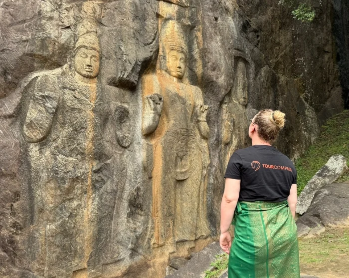 Daarna reist u verder naar de Buduruwagala-tempel, die helemaal teruggaat tot de 10e eeuw. Deze tempel ligt rustig en vredig verscholen in de natuur en staat bekend om zijn indrukwekkende rotsreliëfs. Het Boeddhabeeld, dat maar liefst 16 meter hoog is, torent majestueus boven de zes kleinere beelden uit. Wanneer u goed kijkt, ziet u nog steeds sporen van de levendige kleuren waarmee de beelden ooit beschilderd waren. Het is een fascinerende plek waar u de geschiedenis bijna kunt voelen hangen in de lucht.