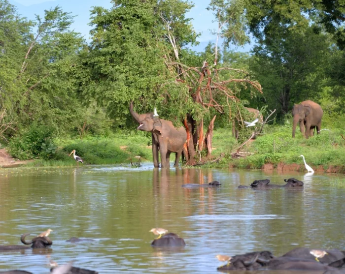 Het landschap van het park is open en overzichtelijk, met uitgestrekte grasvlaktes en lage struiken, waardoor het spotten van dieren extra makkelijk wordt. Behalve olifanten heeft u kans dat u waterbuffels, herten, krokodillen of kleurrijke vogels die laag over de drinkplaatsen scheren, te zien krijgt.