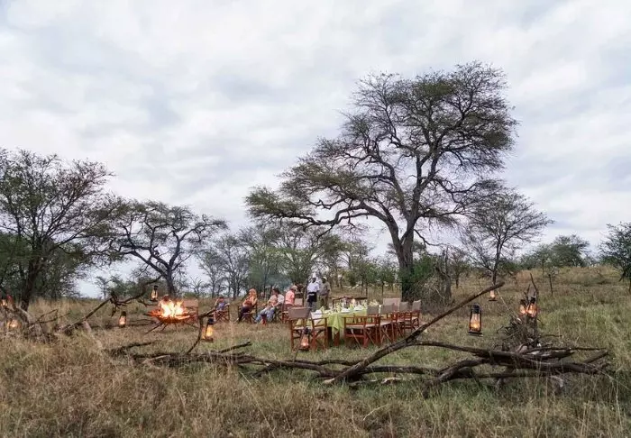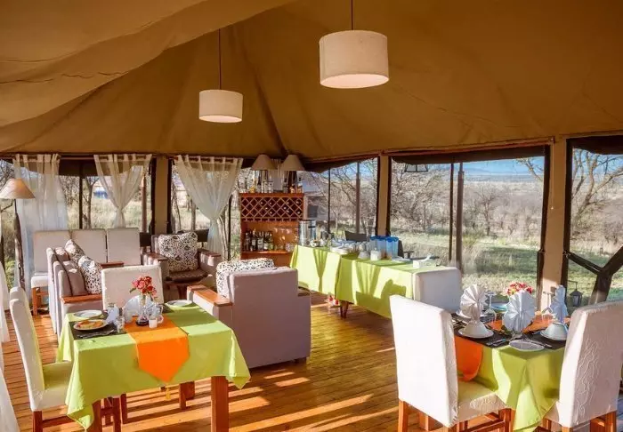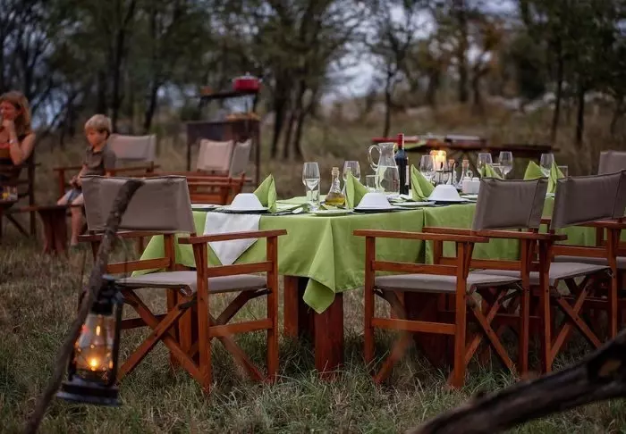 Maaltijden worden meestal genuttigd in de eettent, tenzij de tafel wordt gedekt in de bush buiten, waar u kunt genieten van de Afrikaanse avondhemel bij het knusse kampvuur.