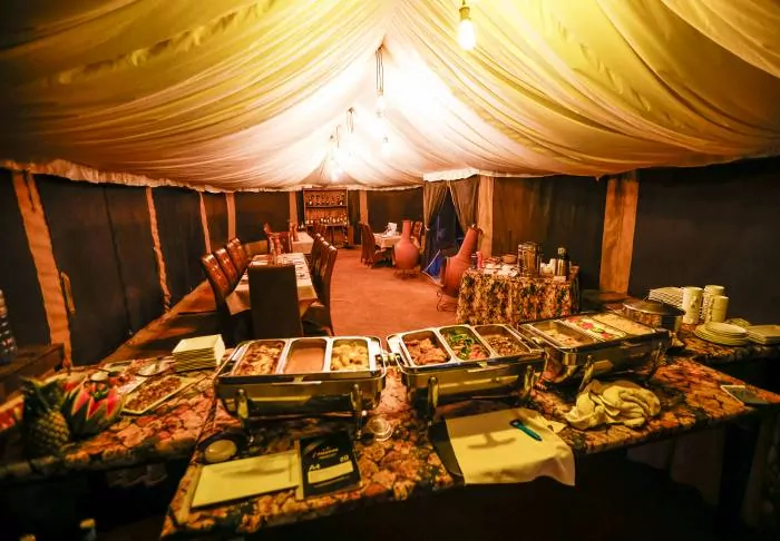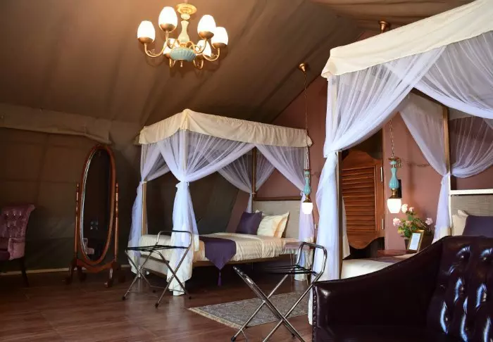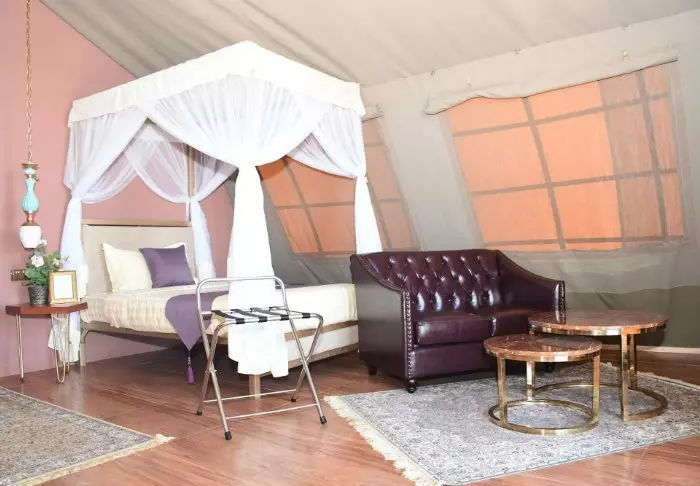 Alle tenten zijn mooi ingericht met een hemelbed met klamboe, bureau, sofa en kroonluchter. In het algemeen is er veel ruimte in de tenten.