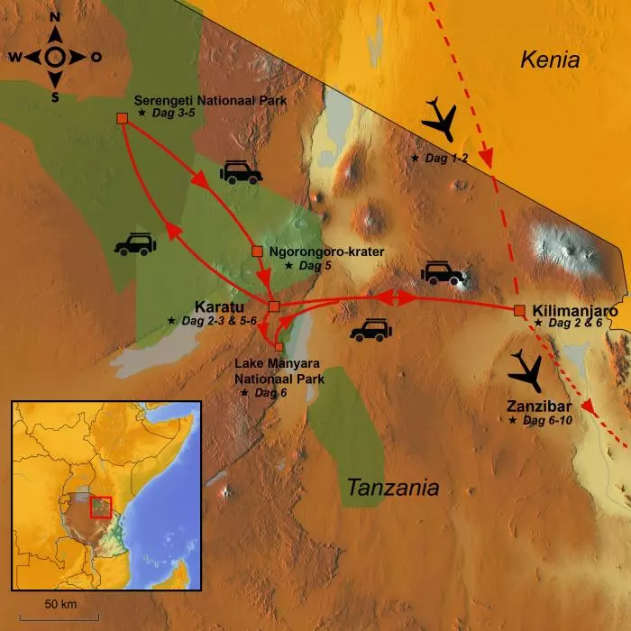 Deze reis laat u de belangrijkste hoogtepunten van een safari in Tanzania beleven: Nationaal park Serengeti, Ngorongoro-krater, Ngorongoro Conservation Area en nationaal park Lake Manyara. U kunt alle iconische dieren van Afrika tijdens een korte en bondige safarireis zien. U overnacht in hotels, maar ook in een tentenkamp waar u heel dicht bij de indrukwekkende Afrikaanse natuur komt. De tenten zijn voorzien van echte bedden en eigen bad en toilet. Het wordt een hoogtepunt van uw reis.