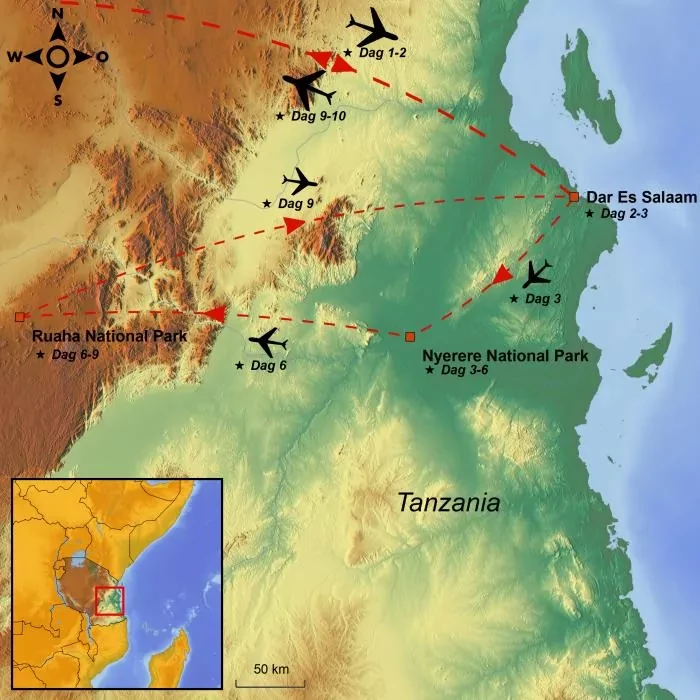 Je landt op de luchthaven van je keuze na een avontuurlijke rondreis door Zuid-Tanzania