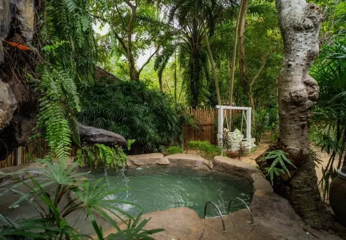 Het resort biedt ook een scala aan faciliteiten voor een complete vakantie-ervaring. Na een dag verkennen kun je een duik nemen in het grote buitenzwembad, dat wordt omringd door tropische bomen en planten, en als je fit wilt blijven tijdens je rondreis, heeft het resort ook een kleine fitnessruimte.