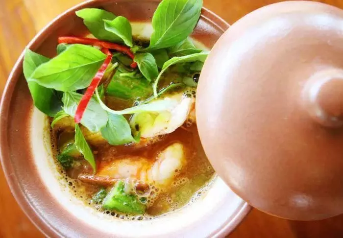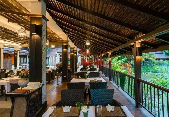 Het restaurant, Golden Teak, heeft een goede selectie Noord-Thaise specialiteiten en internationale gerechten, waar je zowel binnen als buiten van kunt genieten, perfect voor een avond in een prachtige omgeving.