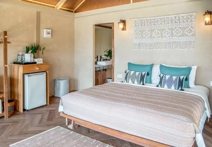 Tamarind Village heeft 46 kamers en suites, prachtig ingericht met handgemaakte meubels en kleurrijke stoffen. Alle kamers bieden moderne faciliteiten voor een comfortabel verblijf, waaronder airco, minibar, wifi, kluisje, koffie- en theefaciliteiten en een prachtig uitzicht op de mooie, weelderige tuinen met tropische vegetatie. De badkamer is elegant en zijn voorzien van een haardroger, badjas, slippers en diverse toiletartikelen.