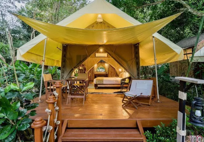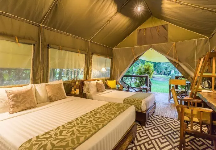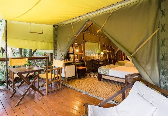 Het camp bestaat uit 38 luxe canvas tenten van tussen de 26 en 32 m², die een halve meter boven de grond staan. Ze hebben allemaal echte bedden, een eigen badkamer met warm water, een föhn en toiletartikelen, en een eigen veranda vanwaar u kunt genieten van de stilte en de weelderige omgeving. Alle tenten hebben ook wifi, airconditioning, make-up tafel/bureau, gratis flesjes mineraalwater, koelkast en waterkoker voor thee en koffie. Na 22.00 uur dient het stil te zijn in het camp – dus geen luide muziek, alleen de geluiden van de jungle.