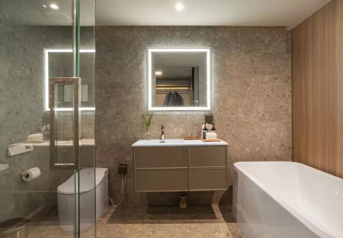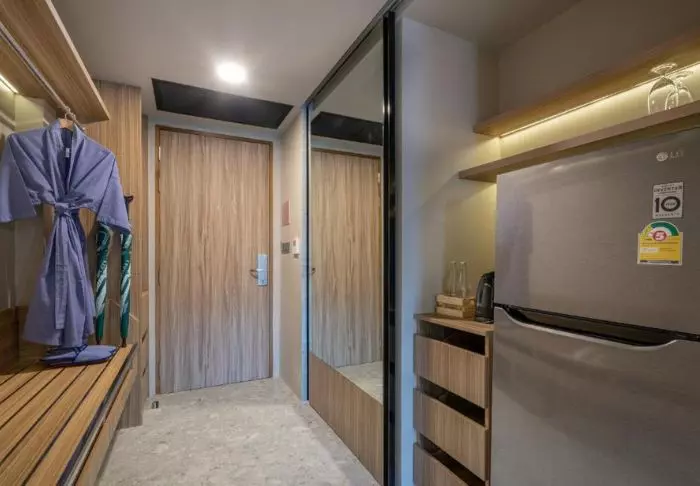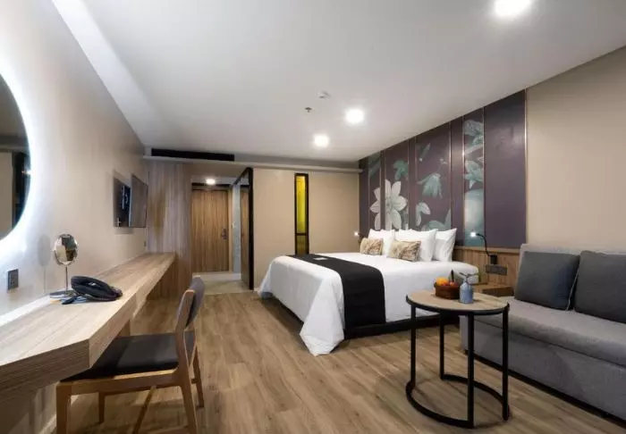De kamers zijn modern ingericht met lichte kleuren en houten meubels. Er is een bureau en een kleine zithoek met een bank en een salontafel. Alle kamers zijn voorzien van airconditioning, kluisje, tv, minibar en een kleine koelkast. In de badkamer vindt u een föhn, toiletartikelen, badjassen en badslippers.