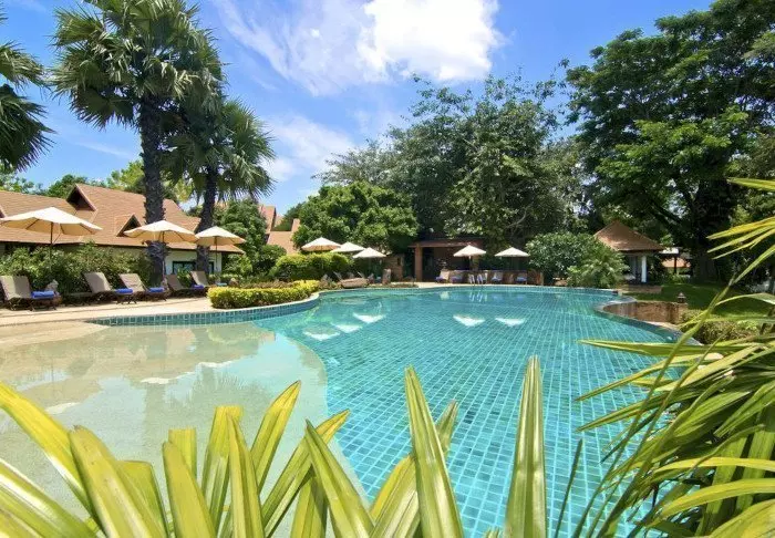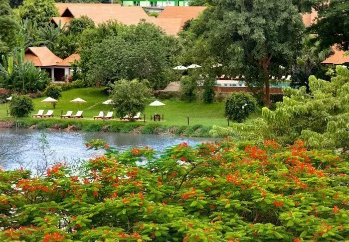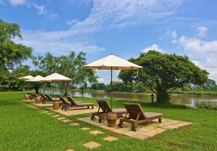 Het resort is gebouwd in traditionele Lanna-stijl en is in mooie harmonie met de omgeving. De gebouwen zijn verspreid over het grote perceel, en omvat schaduwrijke paadjes, lotusvijvers, bloementuinen en een groot gazon met ligstoelen waar u kunt relaxen en genieten van het uitzicht op de rivier.