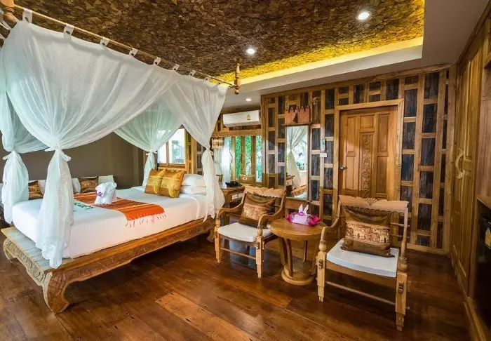 Santhiya Tree Koh Chang Resort heeft 85 kamers in dezelfde consistente stijl van teakhout met houtsnijwerk in het meubilair, op de muurpanelen en op de gezellige veranda. Alle kamers hebben wifi, airconditioning, koelkast, minibar, kluis, koffie- en theefaciliteiten en gratis mineraalwater in flessen, terwijl de badkamers zijn uitgerust met zowel een douche als een bad, haardroger, badjas, slippers en toiletartikelen.