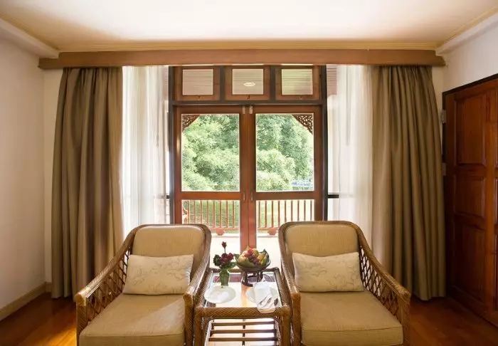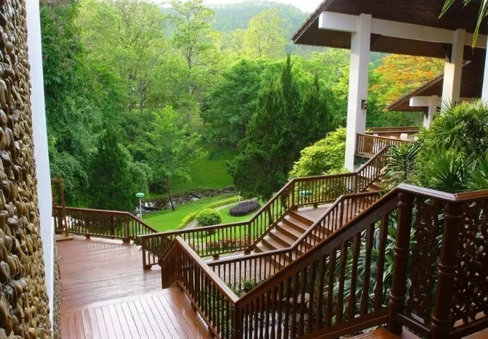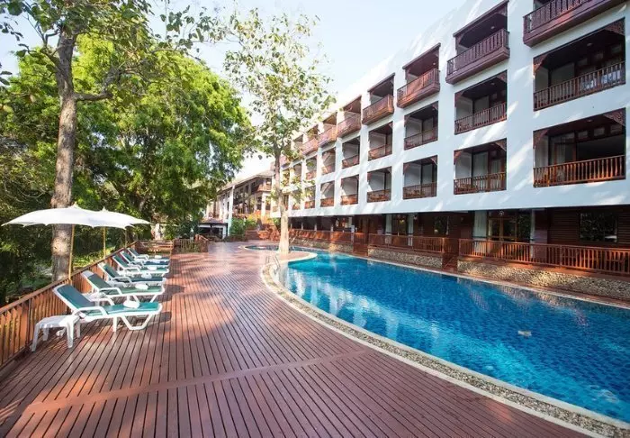 Het resort is gebouwd en ingericht met prachtig, donker hout en straalt Noord-Thaise charme uit.