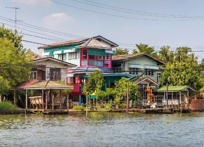 Vanaf hier loopt een klein stukje naar beneden, naar de Chao Phraya, de Rivier van de Koningen, waar u aan boord stapt van een langstaartboot. U wordt de wijk Thonburi, in het westen van Bangkok, binnengevaren via een doolhof van kanalen, ook wel ‘klongs’ genoemd. Vroeger vond het grootste deel van de dagelijkse handel in Bangkok plaats op en langs de kanalen, en wel in zo’n omvang dat de vroegere Europese handelsreizigers en andere bezoekers de stad ‘het Venetië van het Oosten’ noemden. De kanalen zijn nog steeds erg belangrijk voor de plaatselijke bevolking en stralen een mooie weelderigheid, rust en charme uit. Langs de kanalen staan huizen op palen, vanwaar kleine trappen naar het water leiden. U kunt hier mensen zien die hun haar aan het wassen zijn of hun kleding uitspoelen. Op de veranda’s ziet u vaak kleine kinderen met hun oma’s, die wachten op de boot van de postbode of van de ijsverkoper. Dit deel van Bangkok vormt een groot contrast met het centrale Bangkok, waar wolkenkrabbers, hoge spoorlijnen en snelwegen het beeld bepalen.