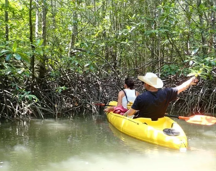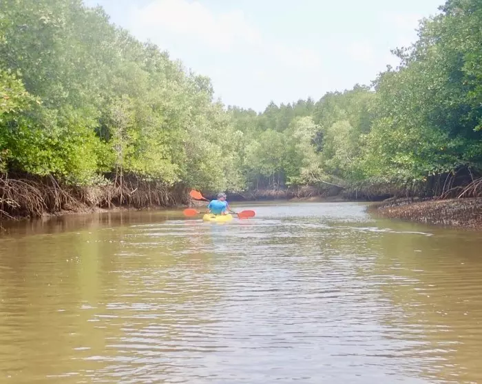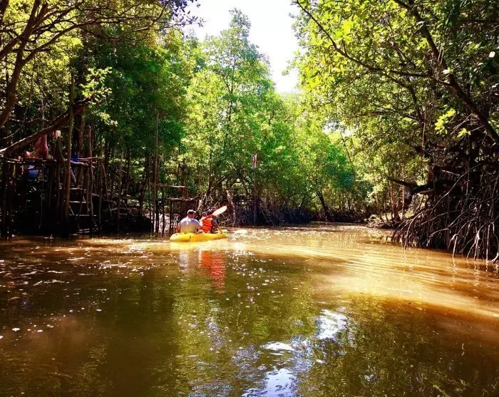 Rustig peddelen door de smalle wateren in de schaduw van de mangrovebomen is werkelijk geweldig. Luister naar de geluiden van de natuur en geniet van de wilde dieren die u ziet. Het mangrovebos is een broedplaats voor vogels en een belangrijk leefgebied voor vissen, garnalen, rivierkreeften, schaaldieren, slakken en slijkspringers. U komt waarschijnlijk ook makaken tegen, die goed gedijen in het mangrovebos.