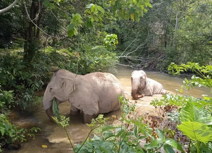 Deze twee olifanten zijn opgegroeid in een olifantenkamp en hebben in de bosbouw en de entertainmentsector van Koh Lanta gewerkt. In 2017 besloot Charae “Ray” Sangkaow, de eigenaar, om het olifantenkamp te veranderen in een authentieke, duurzame en olifantvriendelijke plek. Hij kreeg hulp van World Animal Protection om zijn droom te verwezenlijken en een zo natuurlijk en veilig mogelijk toevluchtsoord voor de olifanten te creëren. Jahn en Mae Thongsuk hoefden dus nooit meer ritjes te maken of boomstammen op te tillen. Following Giant werkt nog steeds actief samen met World Animal Protection op het gebied van training en ontwikkeling, en het verbeteren van het welzijn van de olifanten en van hun omgeving.