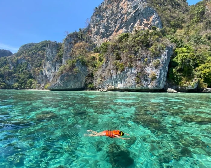 Vervolgens vaart u naar een schilderachtige snorkelplek bij Phi Phi Don, waar u tussen kleurrijke vissen en koralen zwemt – alle benodigde uitrusting is uiteraard inbegrepen.