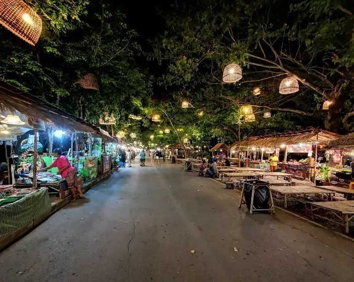 Vervolgens stop je bij een lokale avondmarkt, waar je de tijd hebt om tussen de vele kraampjes te struinen. Ontdek lokale lekkernijen zoals gestoofde varkenspoot (khao kha mu), kokosnootpudding en kleefrijst met ei (bua loi khai waan).