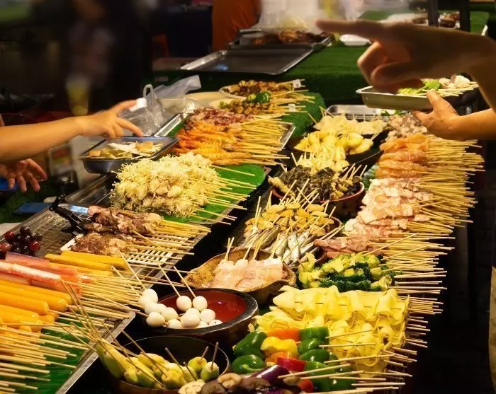 Uw eerste proeverij is een kom “tom yum wonton”, waarbij de klassieke Thaise soep wordt geserveerd met gevulde dumplings – een heerlijke combinatie van pittige, frisse en aromatische smaken. Vervolgens volgt u de onweerstaanbare geur van de grill naar de volgende stop, waar satéspiezen van gegrild varkensvlees boven houtskool worden bereid en geserveerd met een romige pindasaus.