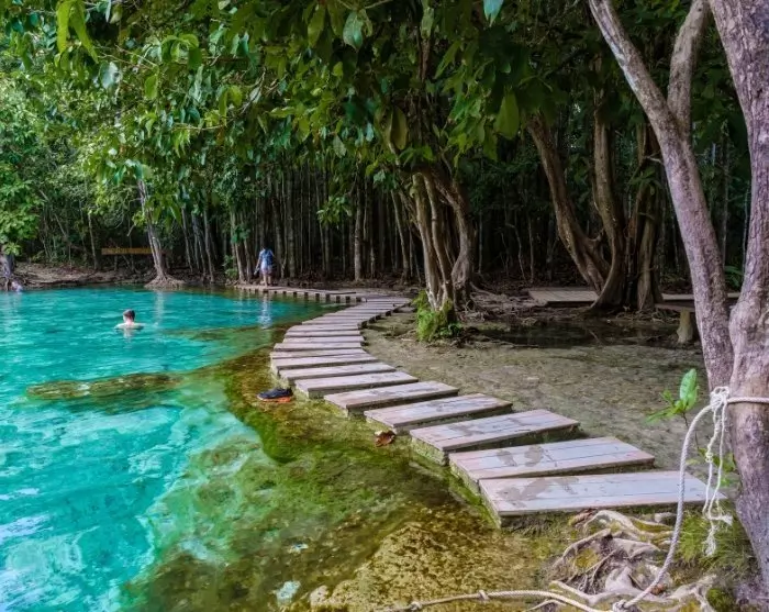 Terug bij de pier zal uw chauffeur wachten om u terug naar het regenwoud te brengen, waar u een heerlijke Thaise lunch geserveerd krijgt voordat u naar uw hotel in Krabi wordt gereden, een reis van ongeveer 3 uur en 30 minuten.