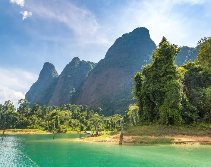 Een deel van Khao Sok nationaal park wordt gevormd door het 165 km2 grote smaragdgroene meer, Cheow Lan. Het meer ontstond toen in 1987 de Rajjaprabha-dam werd gebouwd, waardoor het gebied onder water kwam te staan. 385 lokale families werden verplaatst en gecompenseerd, en dieren werden via de rivieren getransporteerd en per helikopter weggevlogen. Terwijl het gebied steeds verder werd overspoeld door regen- en rivierwater, veranderde een deel van het regenwoud in een meer. De torenhoge kalkstenen kliffen, die ooit hoog tussen de boomkruinen rezen, werden omgevormd tot kleine regenwoudeilanden die tegenwoordig het smaragdgroene water doorklieven. Het is geen wonder dat Cheow Lan soms wordt beschreven als het Thaise antwoord op Guilin, een van China’s mooiste plekken.