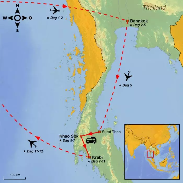U wordt opgehaald bij uw hotel en naar de luchthaven gebracht, waar u op het vliegtuig stapt naar Surat Thani. Deze vlucht duurt 1 uur en 15 minuten. Na aankomst haalt u uw bagage op en ontmoet u uw chauffeur, die u bij de aankomsthal opwacht met een bordje van TourCompass. Hij brengt u naar Nationaal Park Khao Sok, waar een authentiek jungle-avontuur op u wacht.