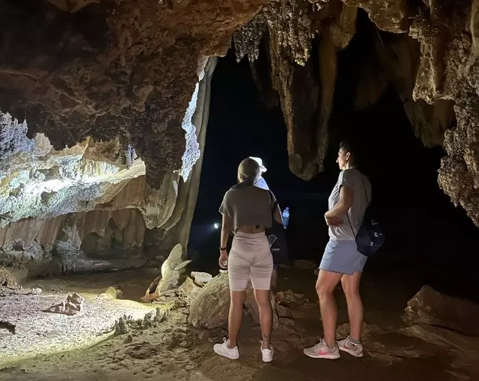 Of u kunt deelnemen aan een spannende wandeling door de jungle naar een van de adembenemende stalactietgrotten in de omgeving, Coral Cave. Zorg ervoor dat u water en goede, dichte schoenen meeneemt, en wees bewust dat het tijdens het regenseizoen glad kan zijn. Vergezeld door uw gids wordt u met een longtailboot naar het beginpunt van de wandeling gebracht. Tijdens de wandeling ervaart u de indrukwekkende plantengroei van de jungle, waarbij uw gids onderweg de verschillende soorten uitlegt. U kunt ook enkele vogels en insecten van de jungle spotten. Na ongeveer 45 minuten bereikt u een lagune waar een bamboevlot wacht om u naar Coral Cave te brengen, wat ongeveer 15 minuten duurt. In de grot ziet u prachtige stalagmieten en stalactieten die lijken op olifanten, heksen en slangen. De terugweg volgt hetzelfde pad als de heenweg.