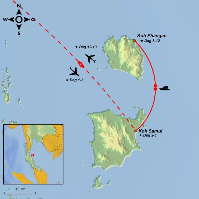 U landt op het vliegveld van Koh Samui, waar u vlot door de immigratie gaat en uw bagage ophaalt. Uw gids wacht u direct buiten de aankomsthal op, gekleed in een TourCompass-uniform en met een TourCompass-bord, zodat u hem of haar meteen ziet. Vervolgens wordt u naar uw hotel gebracht aan de rustige noordkust van het eiland, in een vredige baai bij Mae Nam Beach.