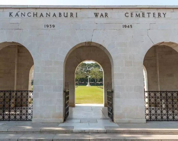 Je gaat verder naar de Kanchanaburi War Cemetery, een gedenkplaats voor meer dan 6000 geallieerde krijgsgevangenen die stierven tijdens de aanleg van de spoorweg en die na de oorlog naar deze laatste rustplaats werden overgebracht.