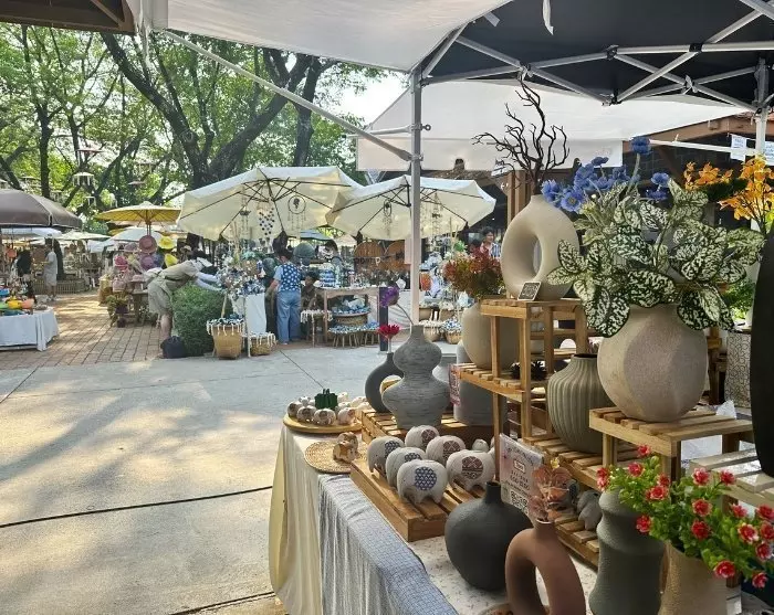 Elke avond verandert Walking Street in een levendige nachtmarkt, waar je alle eetkraampjes kunt verkennen en je kunt laten verleiden door de lokale keuken. De avondmaaltijd wordt genoten op een deken aan een lage tafel, net als de lokale bevolking. Hier kun je ook de Wat Chong Kham-tempel bewonderen, die wordt weerspiegeld in het gelijknamige meer erachter.