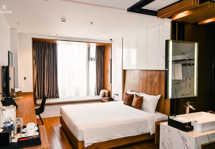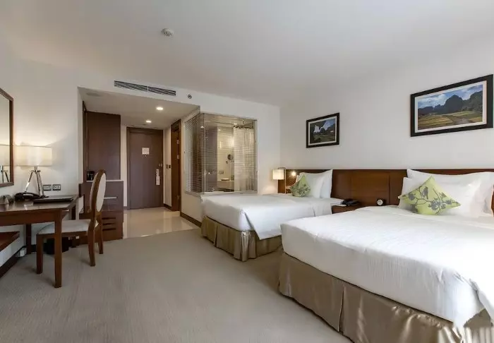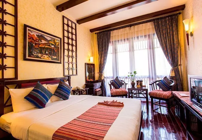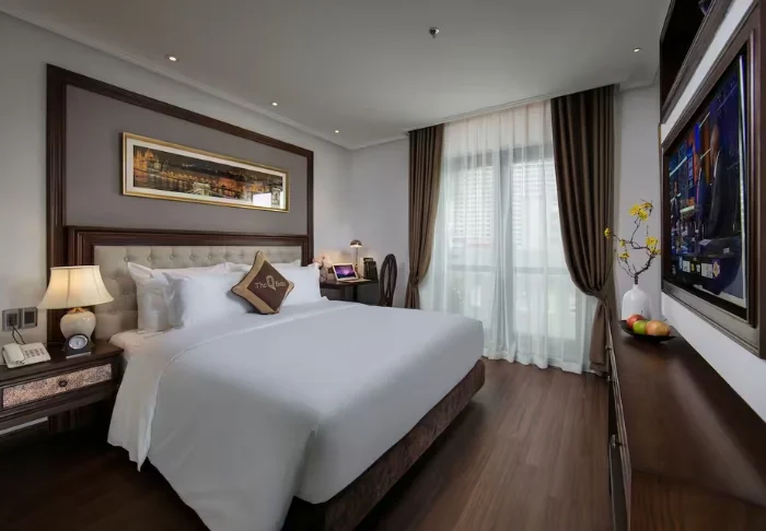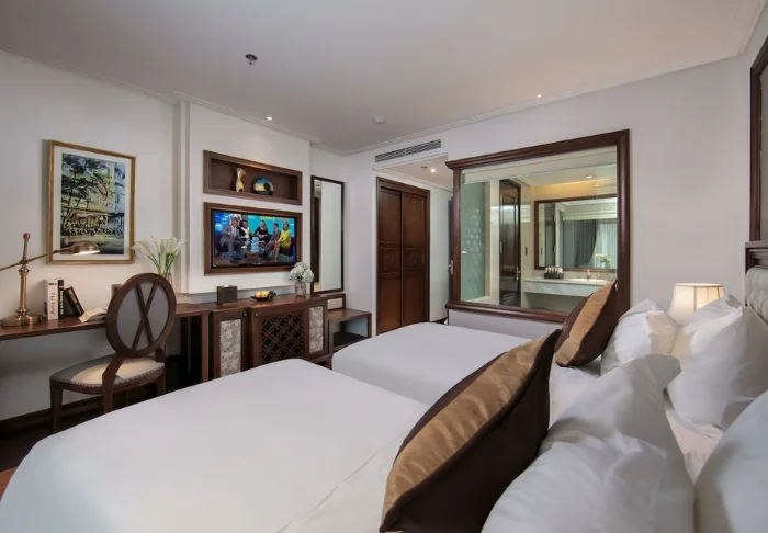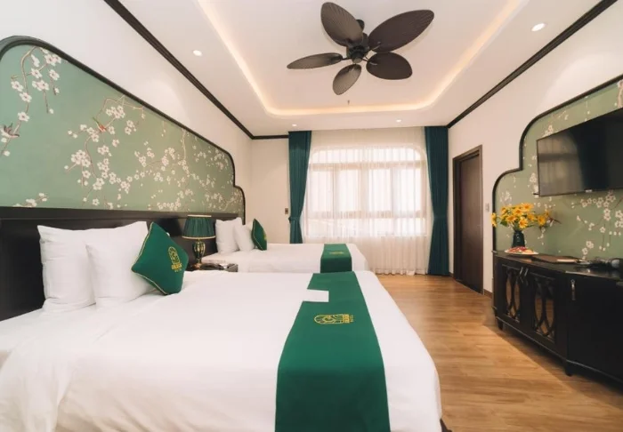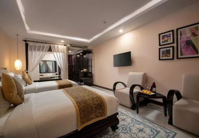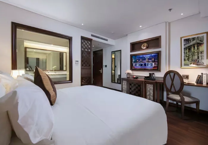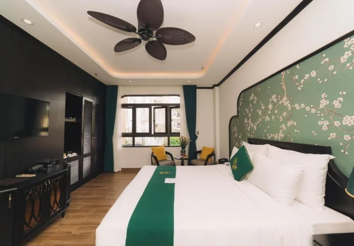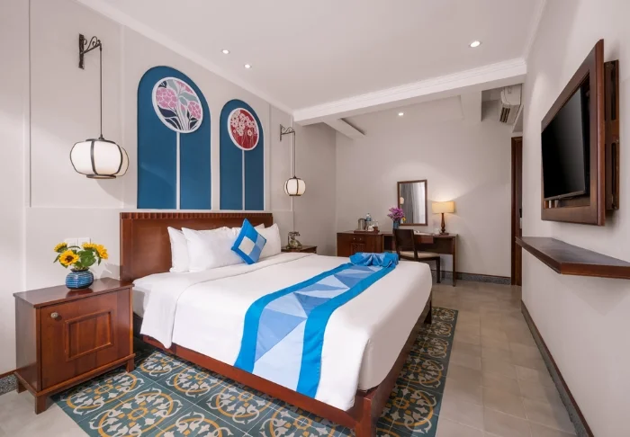 Uw verblijf begint in een superior kamer, waar modern comfort wordt gecombineerd met een vleugje Vietnamese elegantie. De kamers zijn licht dankzij grote ramen en ingericht met houten accenten en klassieke meubels, wat zorgt voor een warme en uitnodigende sfeer. Opvallend zijn de muurpanelen versierd met bloeiende kersenbloesems, die een artistieke en lokale uitstraling geven. Alle kamers beschikken over een tweepersoonsbed of twee aparte bedden, een koelkast, TV, kluisje, waterkoker, airconditioning en een privébadkamer voorzien van toiletartikelen en een föhn. Overal in de kamer vindt u doordachte details voor een kalm toevluchtsoord, ideaal om heerlijk te ontspannen na een dag vol indrukken.