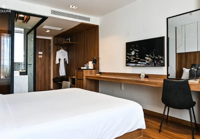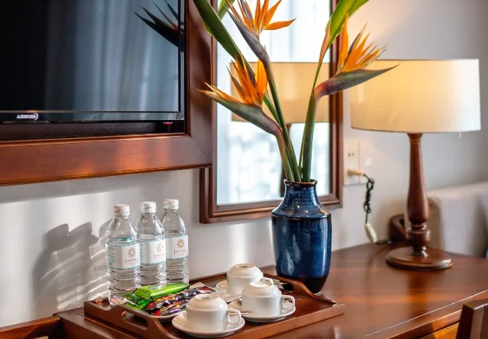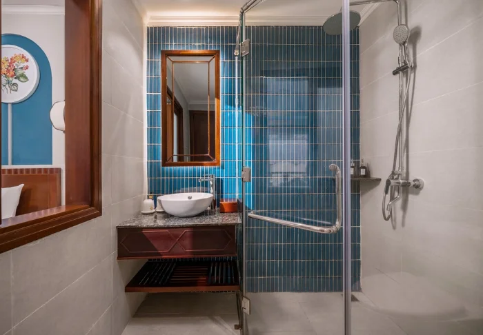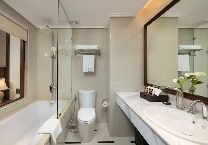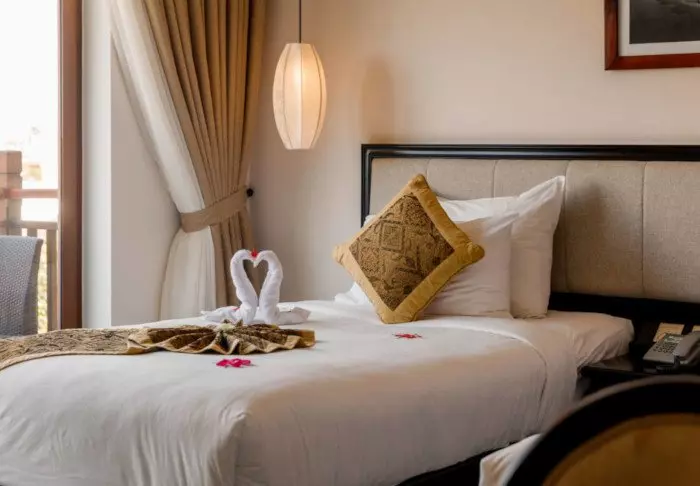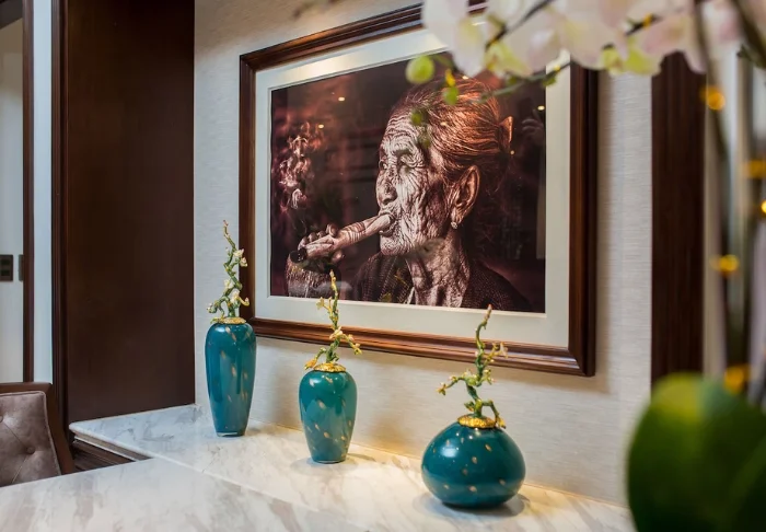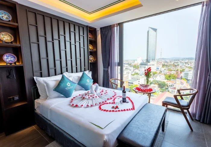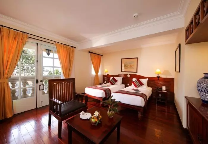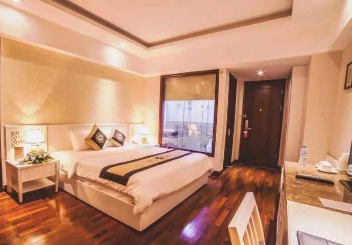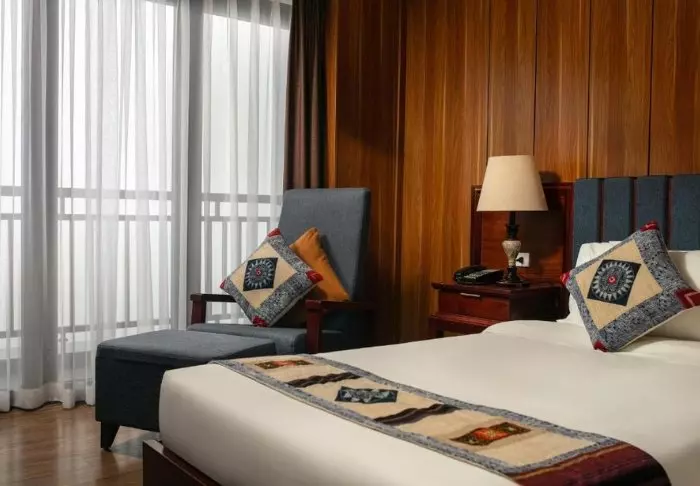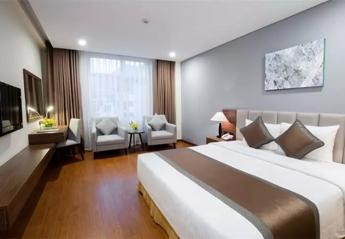 Uw verblijf begint in een superior kamer, waar modern comfort wordt gecombineerd met een vleugje Vietnamese elegantie. De kamers zijn licht dankzij grote ramen en ingericht met houten accenten en klassieke meubels, wat zorgt voor een warme en uitnodigende sfeer. Opvallend zijn de muurpanelen versierd met bloeiende kersenbloesems, die een artistieke en lokale uitstraling geven. Alle kamers beschikken over een tweepersoonsbed of twee aparte bedden, een koelkast, TV, kluisje, waterkoker, airconditioning en een privébadkamer voorzien van toiletartikelen en een föhn. Overal in de kamer vindt u doordachte details voor een kalm toevluchtsoord, ideaal om heerlijk te ontspannen na een dag vol indrukken.