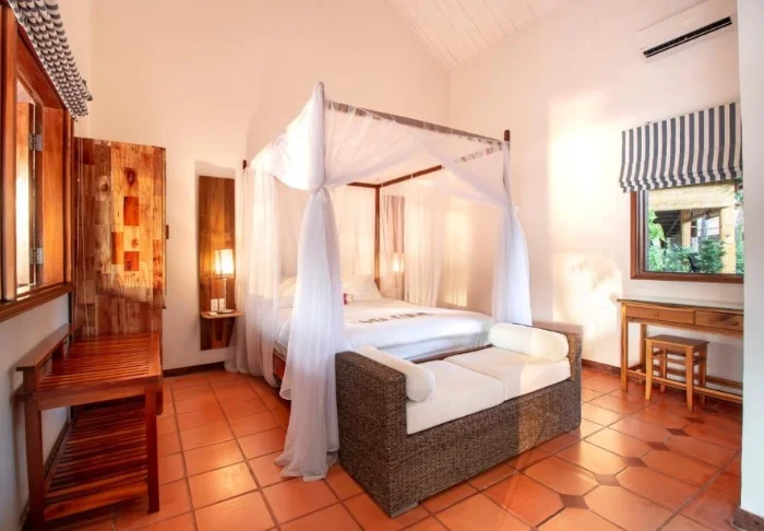 U verblijft in een Garden Cottage, die bereikbaar is via kronkelende paden door de weelderige, met palmen omzoomde tuinen van het hotel, vol kleurrijke bloemen. Vanaf uw terras kijkt u uit op uw eigen tuintje—met een beetje geluk ziet u rijpe passievruchten hangen of bloeiende orchideeën en hibiscus. De kamer is eenvoudig en sfeervol ingericht, met stenen vloeren en grote ramen die veel daglicht binnenlaten. U beschikt over een hemelbed met muskietennet, airconditioning en plafondventilator, wifi, minibar, koffie- en theefaciliteiten, kluisje en een badkamer met regendouche, föhn en toiletartikelen—alles wat u nodig heeft voor een heerlijk ontspannen verblijf.