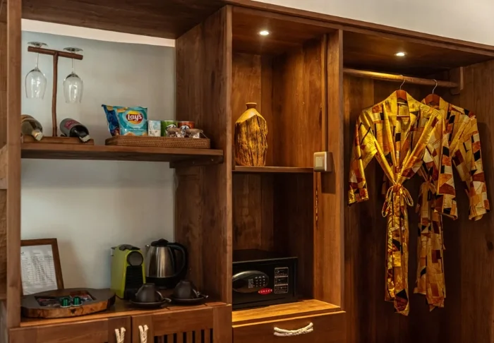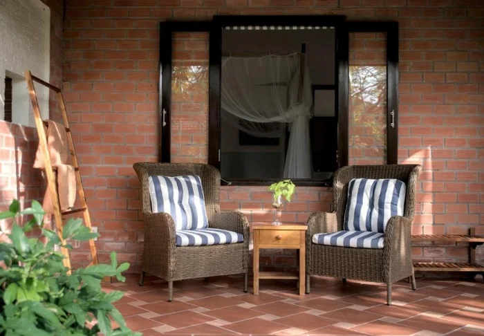 De kamers zijn smaakvol ingericht in een mooie combinatie van natuurlijke kleuren, met een paar contrasterende kleuren op bijvoorbeeld kussens en dekens. De badkamers zijn gedeeltelijk open aan het plafond, zodat u een windje kunt voelen en de tuin kunt ruiken. Alle kamers hebben airconditioning, minibar, thee- en koffiefaciliteiten, kluisje, wifi, flatscreen-tv, muggennetten en een eigen veranda.