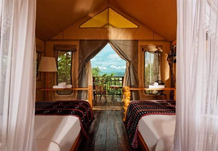 Het tentenkamp ligt verscholen in het groen. U verblijft in één van de Lakeview Tenten van het kamp – ruime tenten op palen, eenvoudig maar stijlvol ingericht. Elke tent is 32 m² groot, inclusief uw eigen veranda, en beschikt over een tweepersoonsbed of twee losse bedden die samengevoegd kunnen worden. Uw tent is uitgerust met airconditioning en een ventilator, bronwater op fles, thee en koffie, en handige extra’s zoals een zaklamp, slippers, een paraplu en een föhn. Elke tent heeft een eigen badkamer met douche en toilet. Op de veranda geniet u aan een handgemaakte tafel met stoelen van rustige ochtenden uitkijkend over het meer en lange avonden in het schemerlicht. Het uitzicht over het meer en het golvende landschap is op zichzelf al een belevenis. Hier ervaart u écht het gevoel midden in de natuur te zijn.