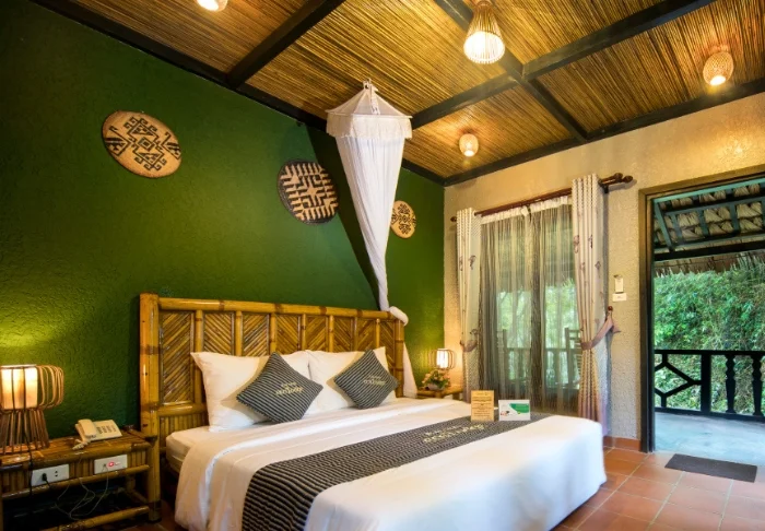 U verblijft doorgaans in een Superior-kamer van 36 m², ideaal voor twee personen. De kamers hebben houten vloeren, donkerhouten meubilair en lichte wanden, wat zorgt voor een rustige, ingetogen uitstraling. U kijkt uit op de Ngo Dong-rivier en de omgeving van het resort, en elke kamer heeft een eigen balkon of terras. Tot de voorzieningen behoren airconditioning en verduisteringsgordijnen, evenals een TV, wifi, telefoon, kluisje, koelkast en waterkoker voor thee en koffie. Er staan gratis flesjes mineraalwater voor u klaar. De badkamer is uitgerust met zowel een douche als een bad en beschikt verder over toiletartikelen, een badjas, slippers en een föhn.