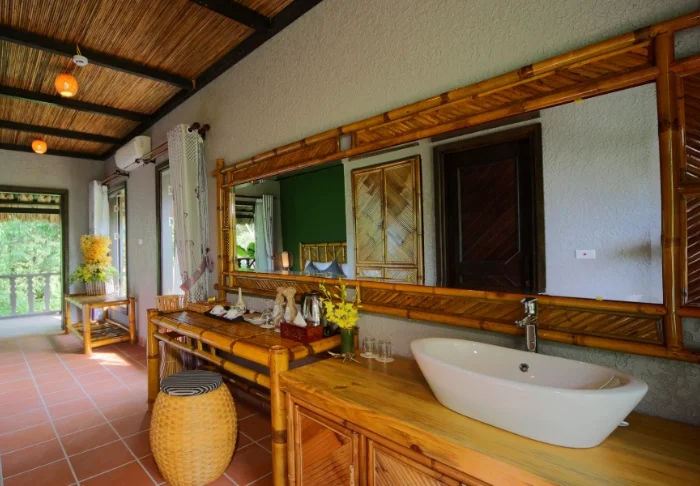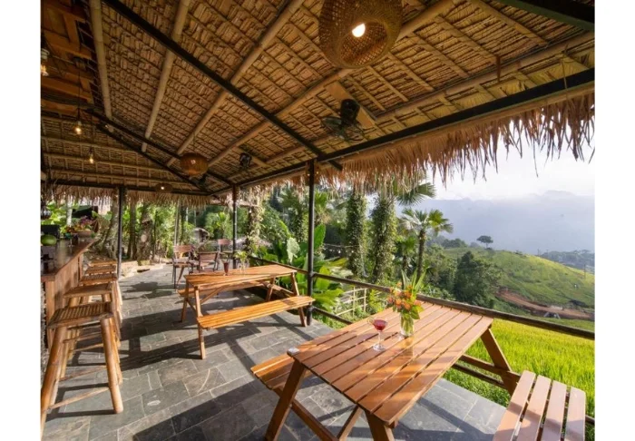 Hier kunt u in en rondom de bamboehuisjes ontspannen en van het uitzicht op de rijstvelden, mooie tuin en betoverende bergen genieten. U heeft hetzelfde mooie uitzicht vanaf het balkon , waar u kunt ontbijten, en vanuit het openluchtrestaurant van het resort.