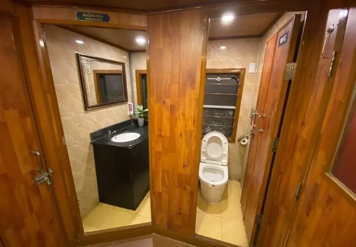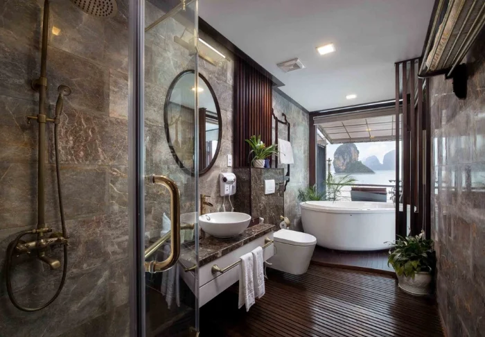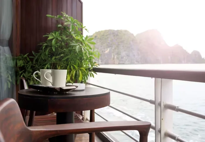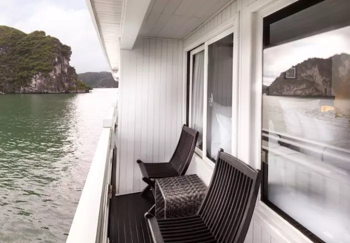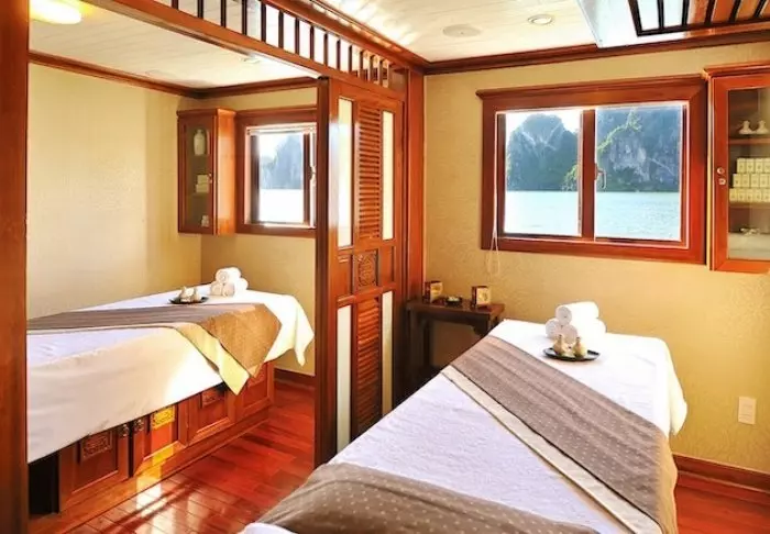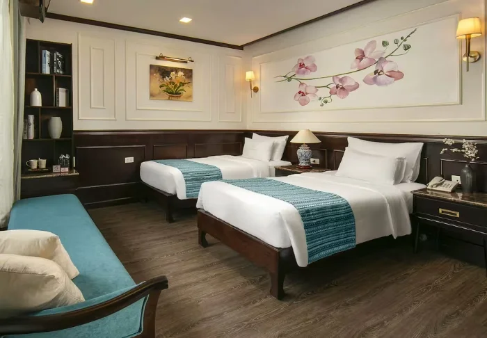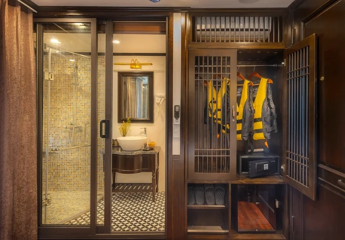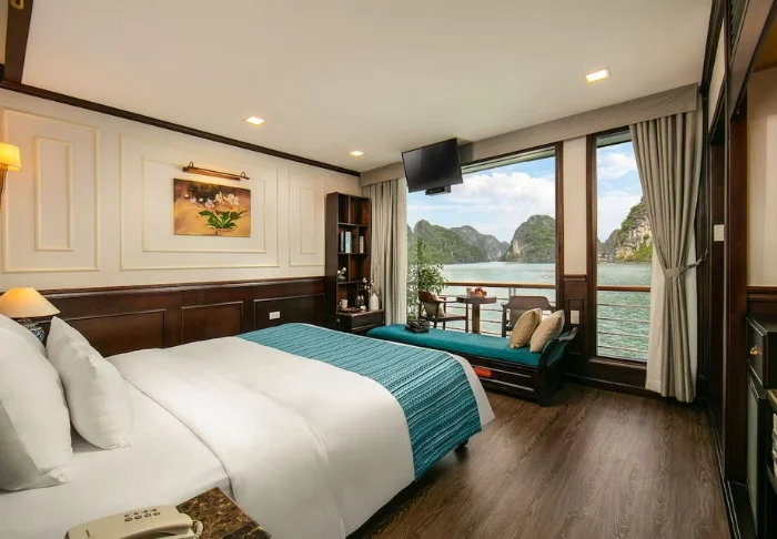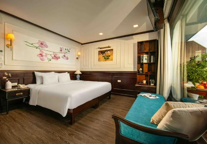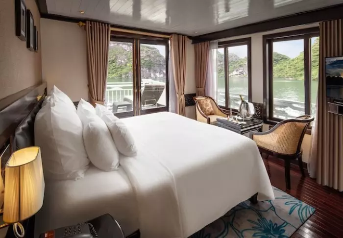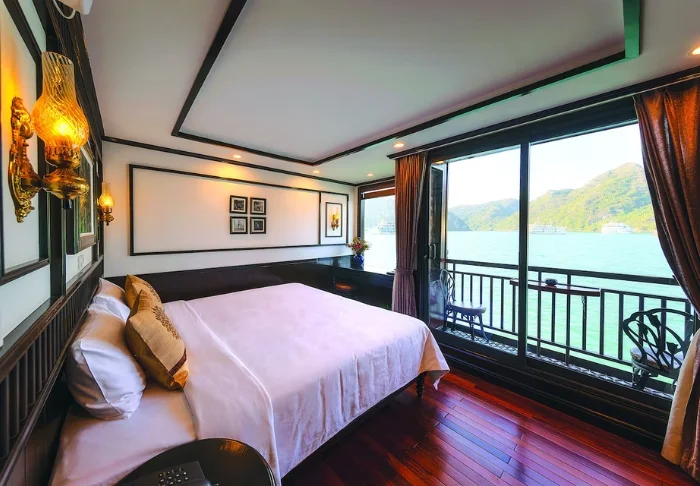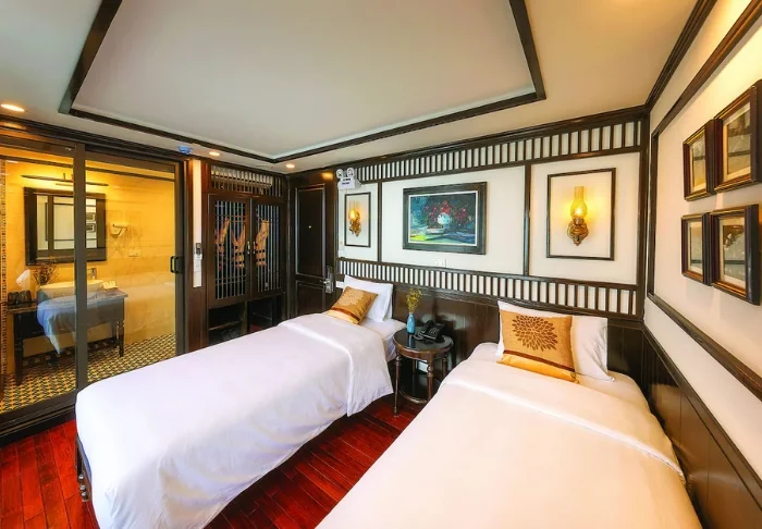 Het schip beschikt over 24 hutten verdeeld over twee dekken, elk geïnspireerd op traditioneel Vietnamees vakmanschap en cultuur. De hutten zijn sfeervol ingericht met donkerhouten wanden, verfijnde decoraties en grote panoramavensters met uitzicht op de baai. Elke hut is voorzien van airconditioning, minibar, kluisje, thee- en koffiefaciliteiten en een badkamer met zowel een bad als aparte douche. Dankzij de ruime opzet, warme materialen en moderne gemakken is dit de perfecte plek om na elke dag vol belevenissen tot rust te komen.