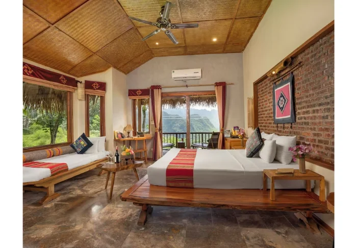 U verblijft standaard in een 32 m2 Deluxe Valley View-kamer met uitzicht op enkele van de mooiste rijstterrassen van de omgeving. De kamer is gebouwd van hout en bamboe, met wanden en plafonds van natuurlijke materialen die de traditionele bouwstijl van Pu Luong weerspiegelen. De gordijnen zijn versierd met geborduurde details die met de hand zijn genaaid door lokale Thaise vrouwen, wat zorgt voor een warme en persoonlijke uitstraling. De kamer beschikt over een kingsize bed en een extra bed, geschikt voor twee volwassenen en één kind. Vanaf het balkon geniet u van de ochtendzon met een kop Vietnamese koffie terwijl het dal langzaam tot leven komt. Verder is de kamer uitgerust met airconditioning, een minibar, een waterkoker en een badkamer met douche en warm water.